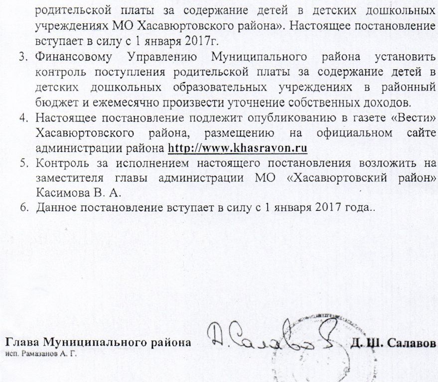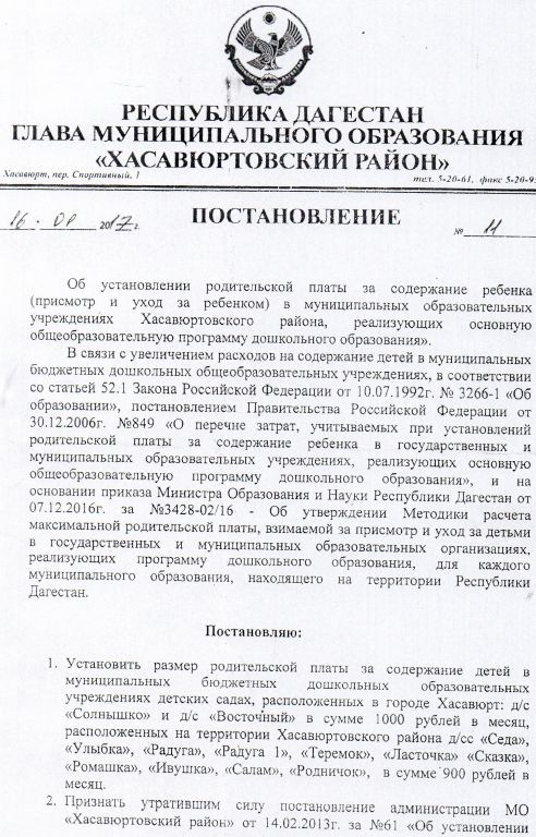 Документ об установлении размера платы, взимаемой с родителей (законных представителей)